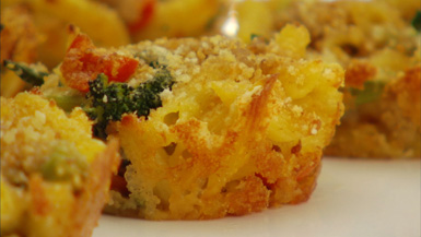 Bring a large pot of salted water to a boil over high heat. Add the pasta and cook until tender but still firm to the bite, stirring occasionally, about 8 to 10 minutes. Drain and place in a large bowl. Add the cooked turkeyandthe cheeses.Seasonwithsalt and pepper to taste. Spoon the prepared pasta mixture into the cupcake molds, filling evenly to about 2/3 full. Place a few pieces of tomato, broccoli and asparagus in each cup. Top with a thin layer of the remaining breadcrumbs and drizzle with olive oil.
